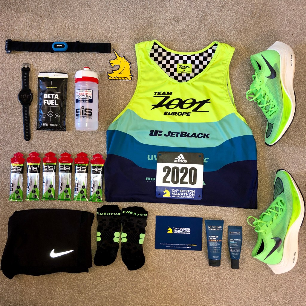 I treated this as I would have treated the real in person Boston Marathon. I had a full 2 week taper, hydrated, ate well and slept well during those 2 weeks. I did run a 5k race and set a new 1 mile and 5k PB during the Mid-Cheshire 5k 2020 9 days before my virtual Boston race day, which granted! isn’t something I would have done for the real race but the opportunity to run a real in-person race after 5 months of no racing was too good to pass. I did gain a lot of confidence from running those fast PB’s coming off the back of the appendicitis and just 7 weeks of running.