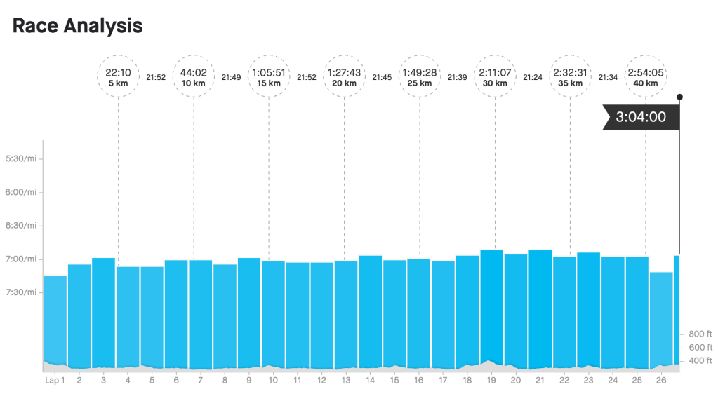 I finished off the final 0.25 mile at 6:56/mi pace, running a little extra to ensure Strava tracks at least 26.2 miles to get the credit for the race. Could you imagine doing all that and Strava tracked 26.19 and the time not counting!