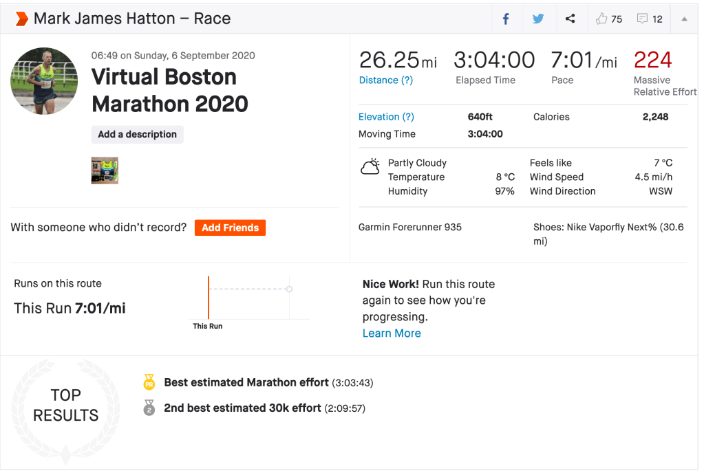 So, job done. Virtual Boston Marathon, 26.25 miles ran in 3:04.00 or 3:03.59 going off Garmin so obviously I am using the Garmin time rather than Strava. Comfortably under the 3:17.48 ran in New York City. I am not going to say this is my second fastest marathon because it isn’t a marathon, its just a 26.2 mile run. It isn’t a measured course and GPS can be off but what it is, is a massive confidence boost and proof that I CAN run a marathon less than 12 weeks after lying in that hospital bed with appendicitis and proof to myself that the 3:01.09 I ran in Tokyo wasn’t a freak result with it being so much faster than my other marathons.