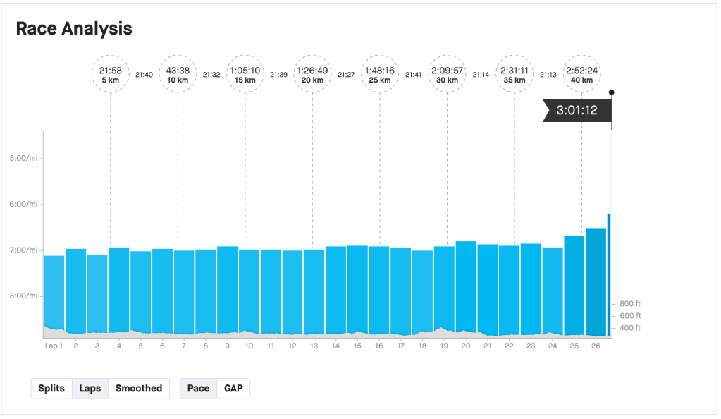 Having just run 11 of the 13 miles under 7:00/mi pace, I can’t say that I was really sticking to the 7:05/mi plan but I was holding the pace back and staying consistent around 6:57 – 6:59.