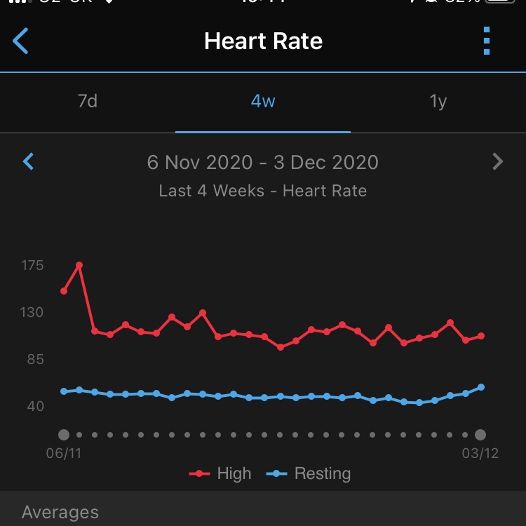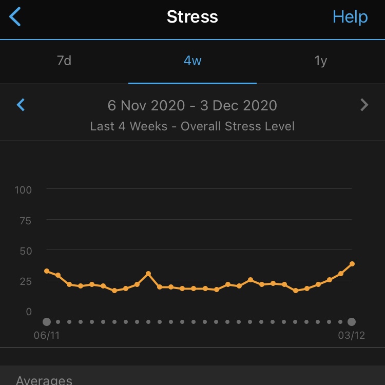 I use my resting heart rate and stress score from my Garmin watch as a way to track my health and pick up signs of illness early. I noticed that my resting heart rate suddenly started to increase (blue line below) and at the same time the stress score picked up (orange line).