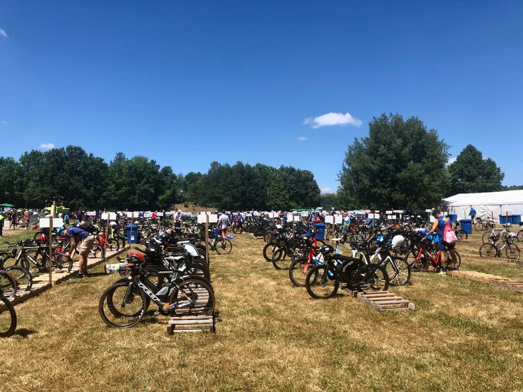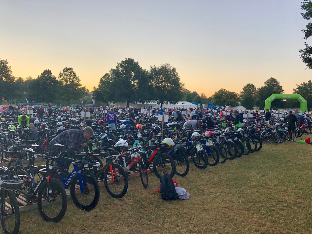 As someone who has mostly done Ironman triathlons, things were a little different to what I was used to. Mainly, at bike check-in you obviously rack the bike but also drop off the blue run bag at T1, they then transport this to T2 ready for tomorrow. You don’t need to leave the red bike bag in T1 until race morning. One other small difference was leaving the helmet on the bike overnight.