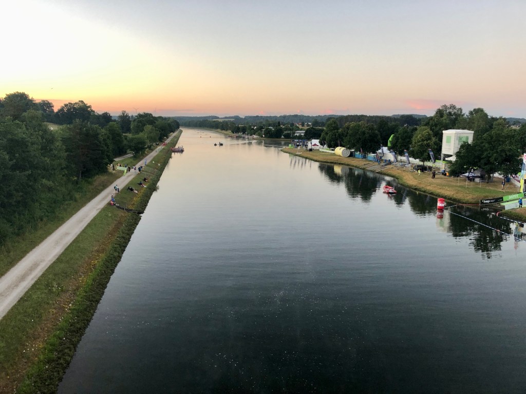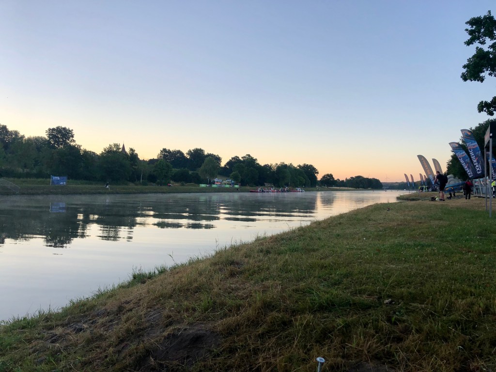 I woke up at 3:25am after just over 6 hours of sleep, I felt quite awake really. I had my two porridge pots in the room, did some stretching and rolling, got my bottles mixed up and left the hotel at 4:30am. I was parked up at the swim start for 5am, just in time for sunrise over the Kanal.