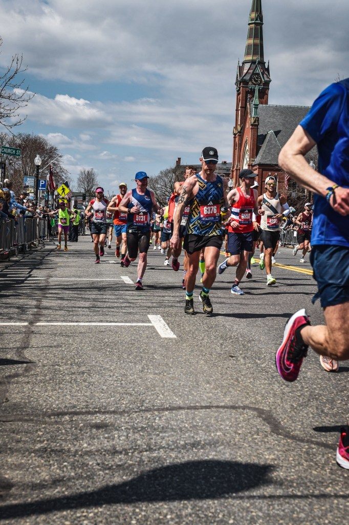 As soon as the gun goes you are running down a steep downhill. Fresh legs filled with Boston Marathon race day adrenaline can really push the time out here, it is important to hold back and stick to the plan. The course is crowded over the first 6 miles which helps to hold you back, but then you are seeding alongside other runners with similar qualifying times so everyone is kinda going at the same pace anyway.