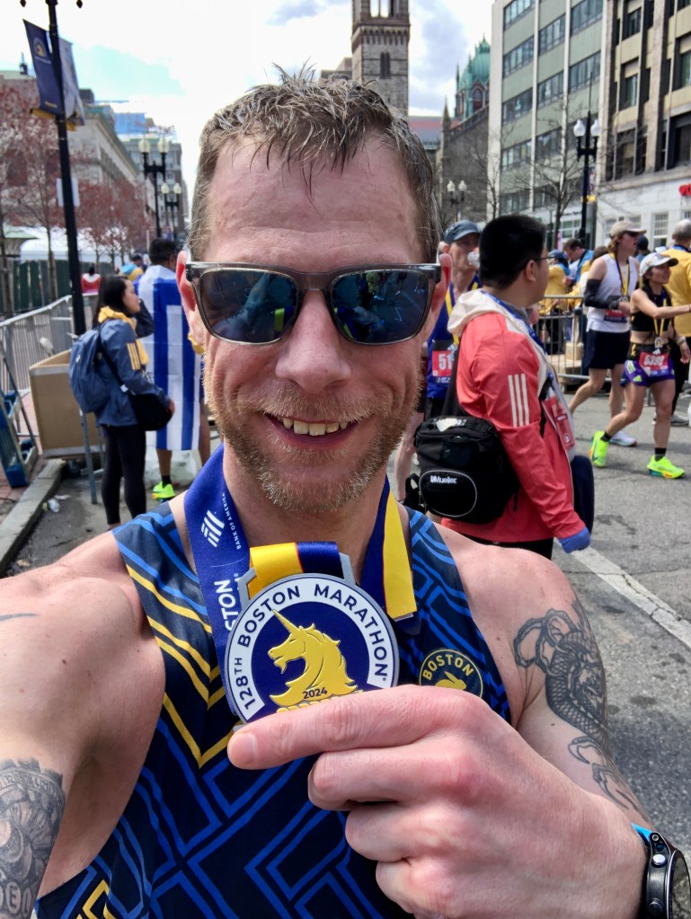 I hung around the finish area for a bit, grabbed my gear check bag and put my jacket on, sent my wife this photo to show I had made it. Only now noticing how much I was sweating and looking like I had been in the rain of 2023. I then walked down to Boylston Station to take the T back to Arlington to collect my case and head to the airport to fly home at 9pm.