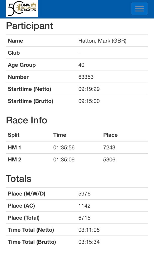 - Despite taking it steady, running the race as a training run with multiple injuries, I crossed the line in 3:11.05 which was 29:59 faster than when I raced Berlin in 2017 and also a 6 minute autumn marathon PB.