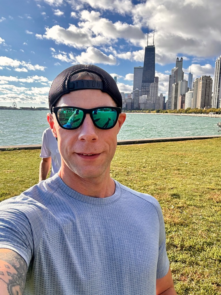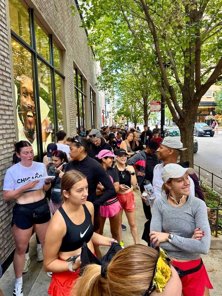 Just like in 2024, we stopped at a grassy area with the cityscape in the background for photos before running the last half mile back to the store. I chatted to a couple of people here, both running the marathon for their 7th time! Being a solo traveller from UK to run in Chicago, I like to join these brand activations and shakeout runs as opposed to the bigger official 5k shakeout, to feel part of the community and be around other marathoners and Lulu fans. These short one-off conversations with strangers like this are what draw me and make me feel included in the group and brand.