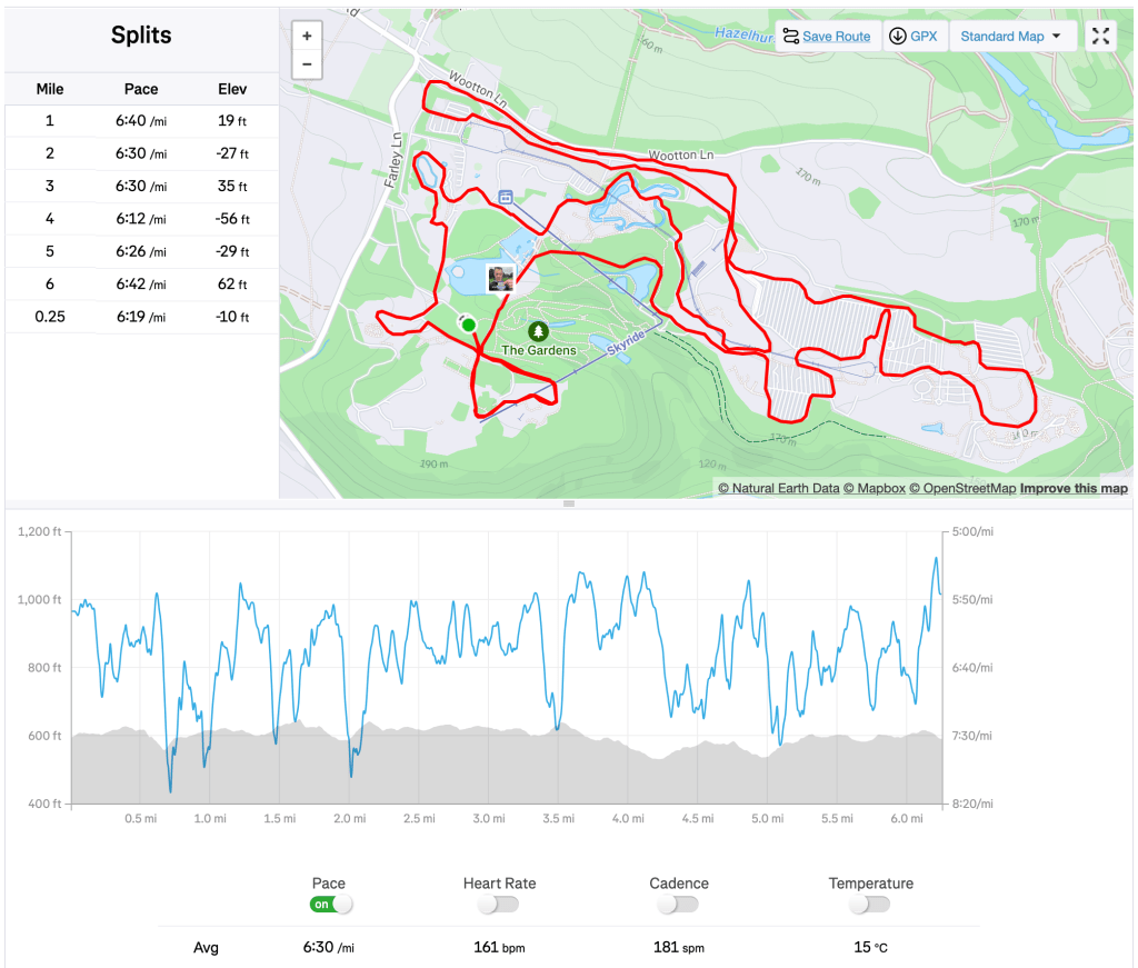 Splits: 6:40, 6:30, 6:30, 6:12, 6:26, 6:42, 6:19