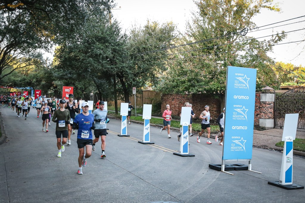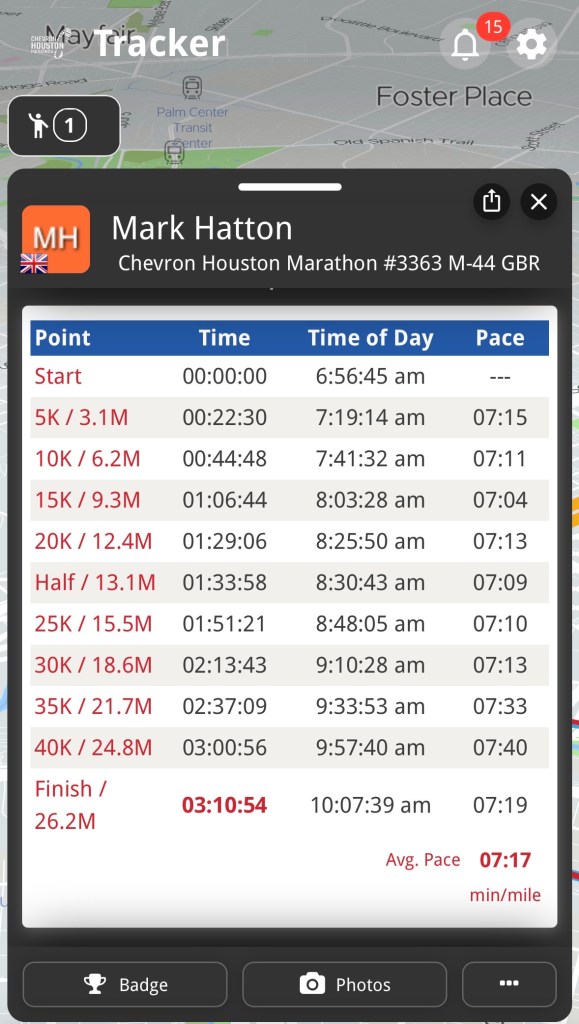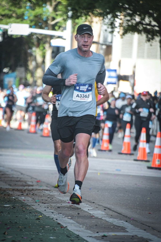 Thoughts on the Houston Marathon, I loved it. The course is very flat and fast, the roads are wide, and the number of people running is far fewer than in the World Marathon Majors; we had plenty of space to run our own pace. On-course aid stations were spot on, every mile from mile 2. The crowds were a lot less than the majors, too, but still quite a lot out there, they said to expect around 250k spectators. The weather was perfect this year too, around 3 °C – 10 °C during the marathon with little wind and no rain. If you are looking for a good early season fast marathon, give Houston a try, just bare in mind, with the race being the second Sunday of January, your peak training week will fall on Christmas week, that made things tricky for me fitting in the training, more so with it being school half term and having to entertain a 10yr old all day and run at night… first world problems right?